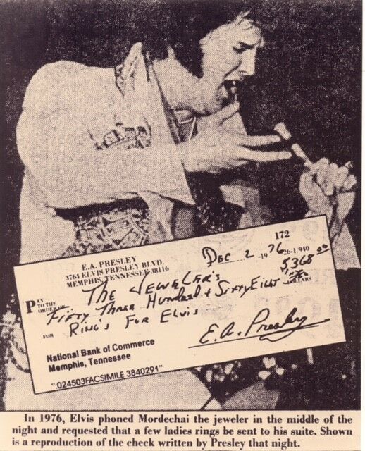 عندما غنّى إلفيس بريسلي في فيغاس، عرض عليه مردخاي يروشالمي مجموعة مختارة من المجوهرات قبل استعراضاته. "في منتصف إحدى ليالي تشرين الأوّل 1976، طلب منه الملك إحضار العديد من خواتم الماس مباشرة إلى جناحه. يحتفظ الصائغ "بذاكرة ثمينة"، بل أوضح أنّه صوّر نسخة من الشيك الذي منحه إيّاه النجم في ذلك المساء. يقول تقرير مجلس الماس الطبيعي، الذي نقل اعترافات الصائغ.
