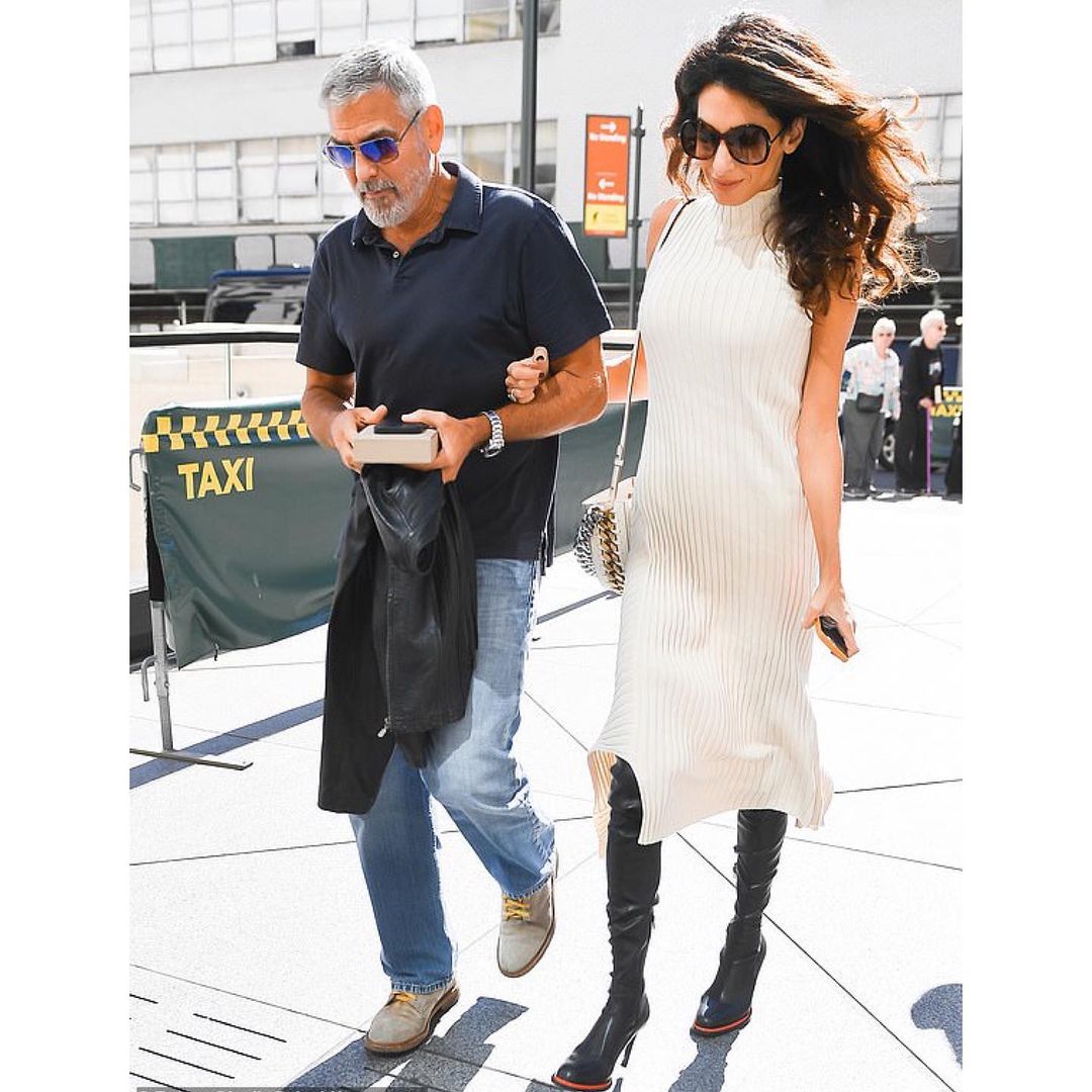 شوهدت الأستاذة والمحامية بجامعة كولومبيا وهي تستقل قطار Amtrak مع زوجها، جورج كلوني، مرتدية زيًّا خريفيًا بسيطًا وأنيقًا: فستان ميدي غير متماثل باللون الكريمي المضلّع وحقيبة Frayme bag باللون البيج، وكلاهما من مصممتها المفضلة، ستيلا مكارتني.
