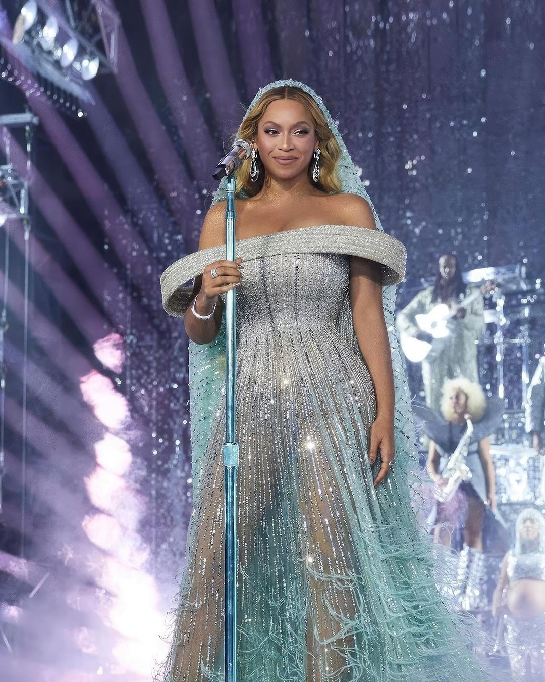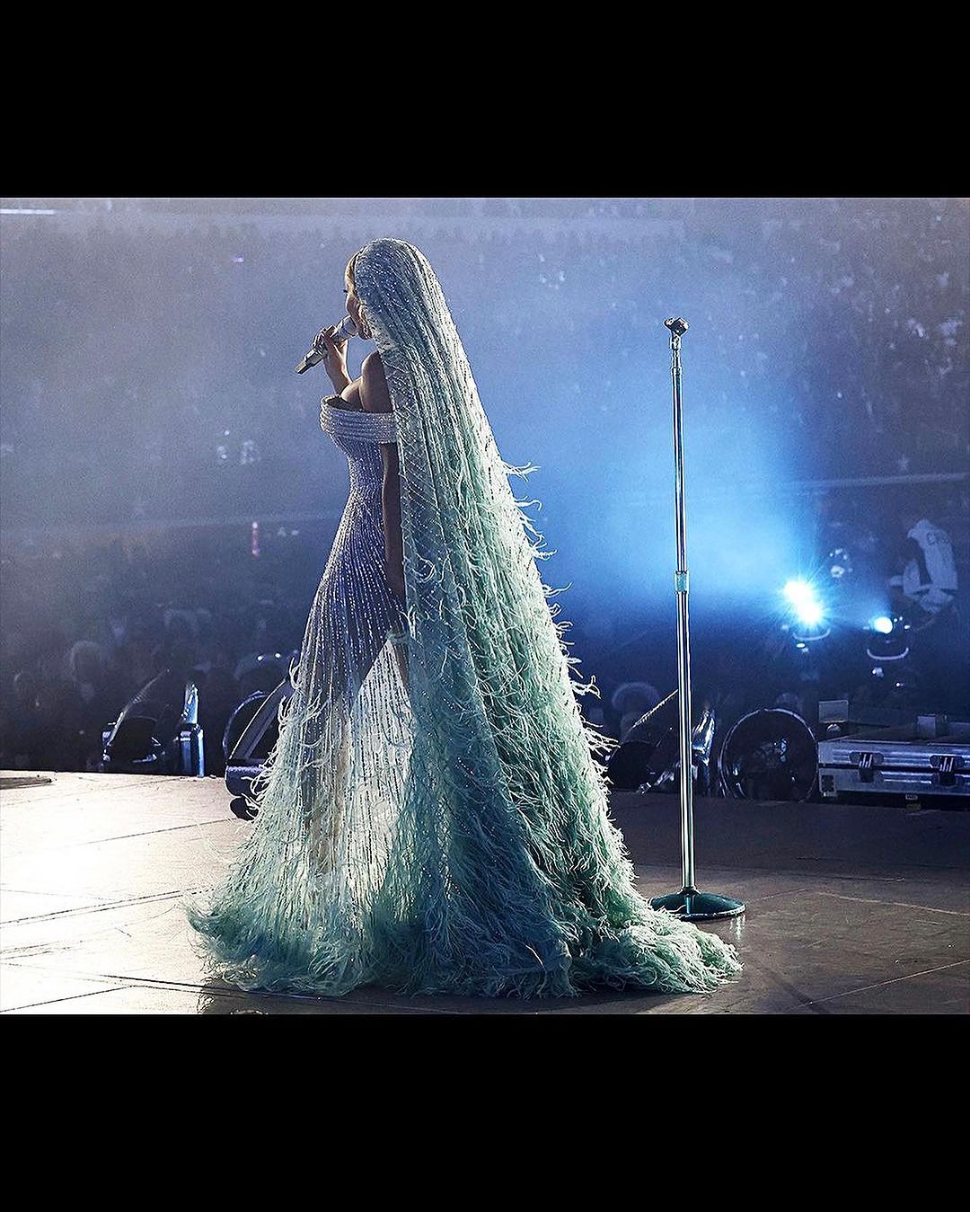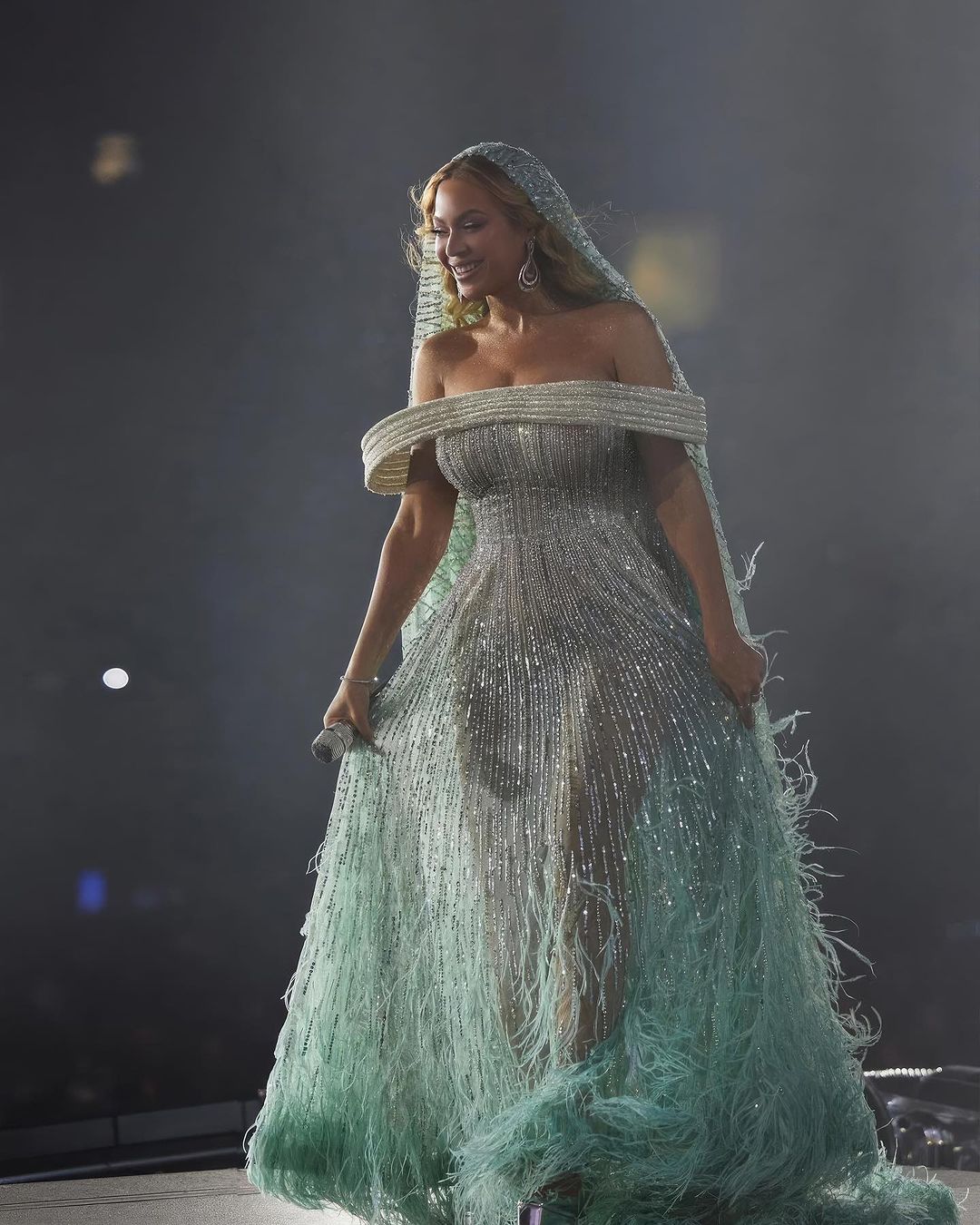 ظهرت بيونسيه يوم السبت في دالاس بإطلالة مذهلة من توقيع المبدع اللبناني العالمي جورج حبيقة في تكساس في جولة Renaissance. لاشكّ أنّ بداية بيونسيه كانت في دالاس بتكساس، لذا عادت الأيقونة إلى ولايتها الأصلية. الثوب لفت الأنظار بشكل لا مثيل له، ارتدت نجمة الغناء والموسيقى فستانًا أخضر مائيًّا شفافًا مطرّزًا بالفضّة مع فتحة عنق منحوتة خارج الكتفين شبيهة بياقة الكول باتو وطرحة طويلة مطابقة. زُيّنت حافة التنورة والطرحة بتفاصيل من الريش الذي كان يرفرف حولها كلّما تحرّكت. تلك التحفة التي صمّمت من قبل جورج حبيقة أذهلت الحضور وبدت كمثال للأناقة الخالدة.