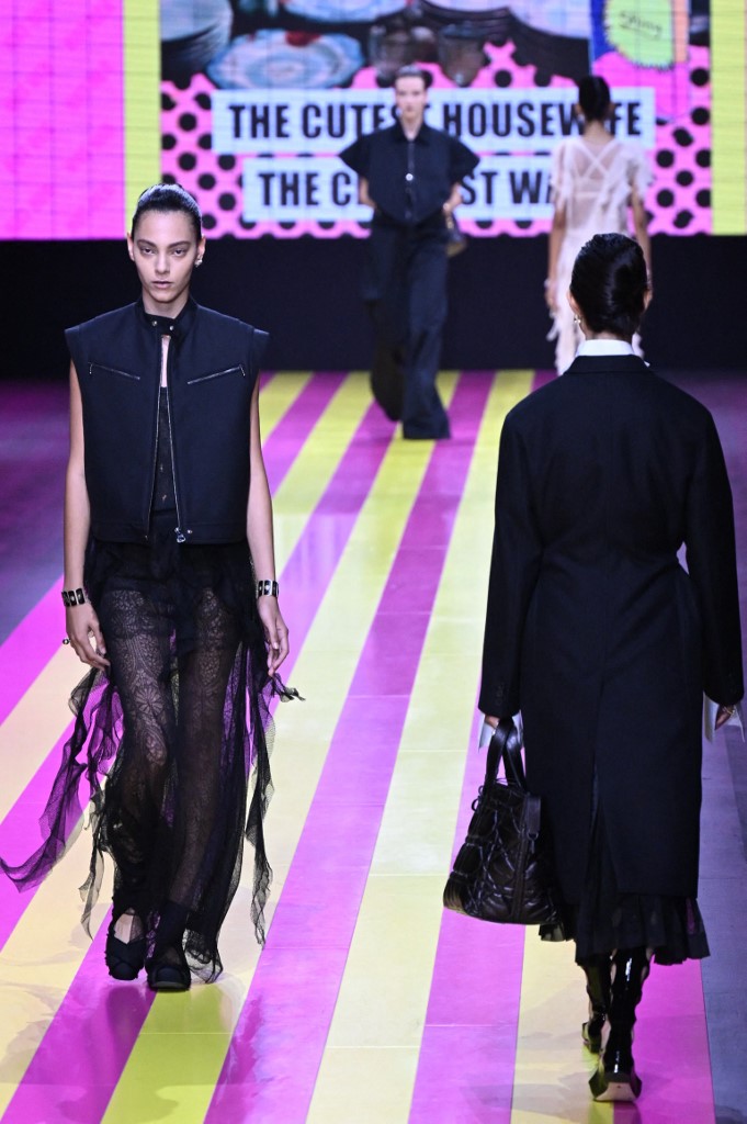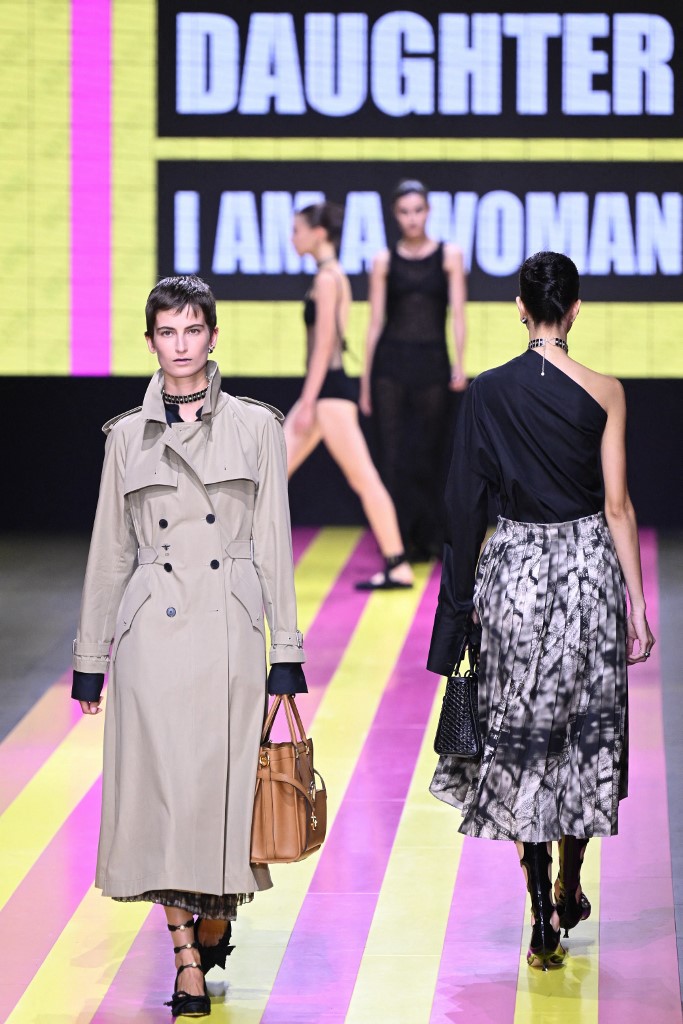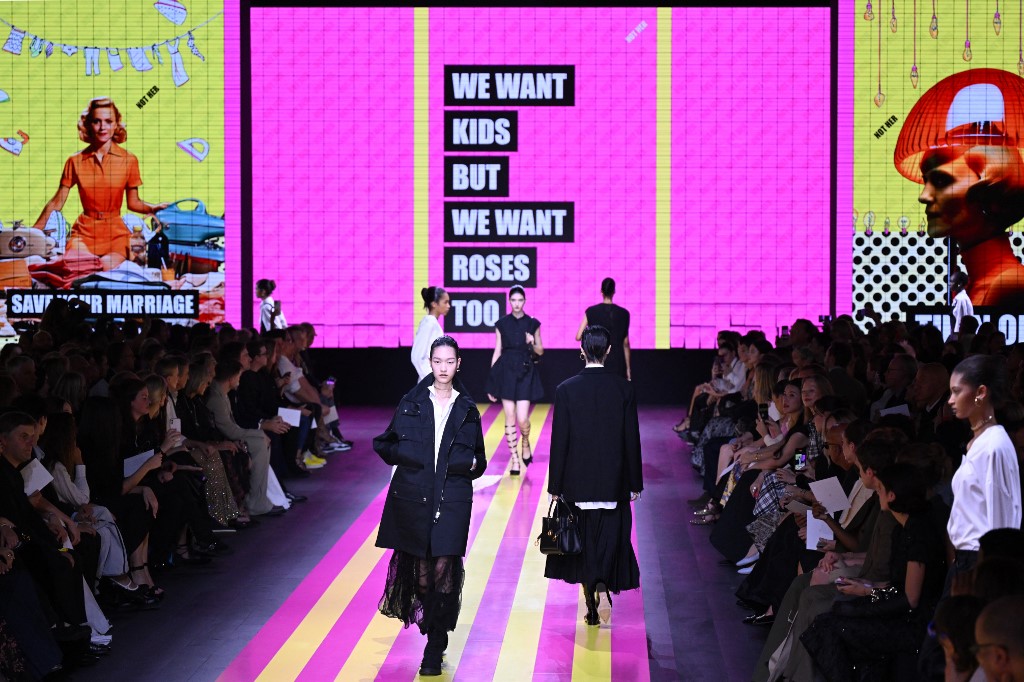 وتحرّكت العارضات على منصّة مظلمة على خلفيات باللونَين الأصفر والوردي تعرُض أعمالاً فنية من تصميم إيلينا بيلانتوني، عبارة عن إعلانات منذ الستينيات تتضمّن رسوماً كاريكاتورية لصور نمطية عن أدوار النساء.