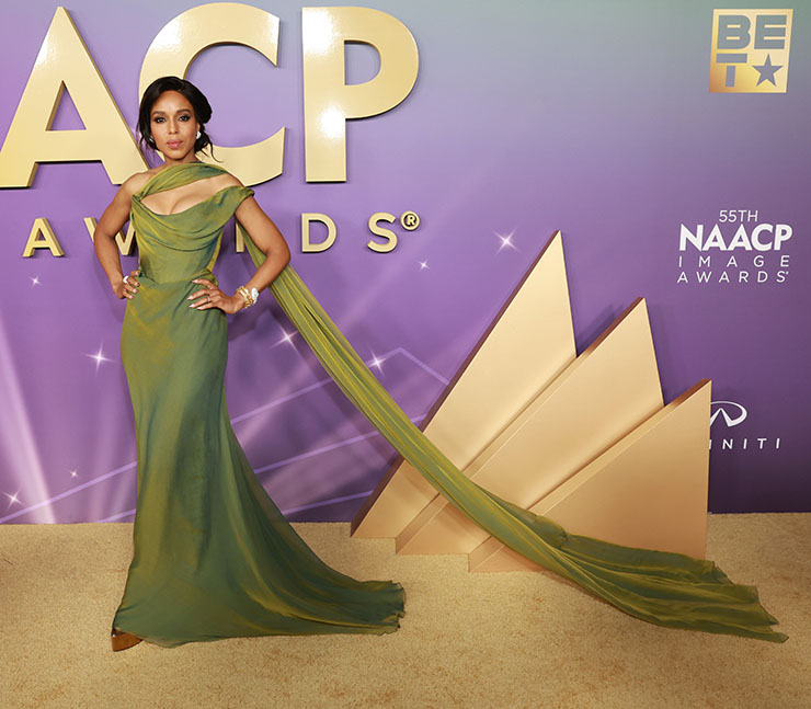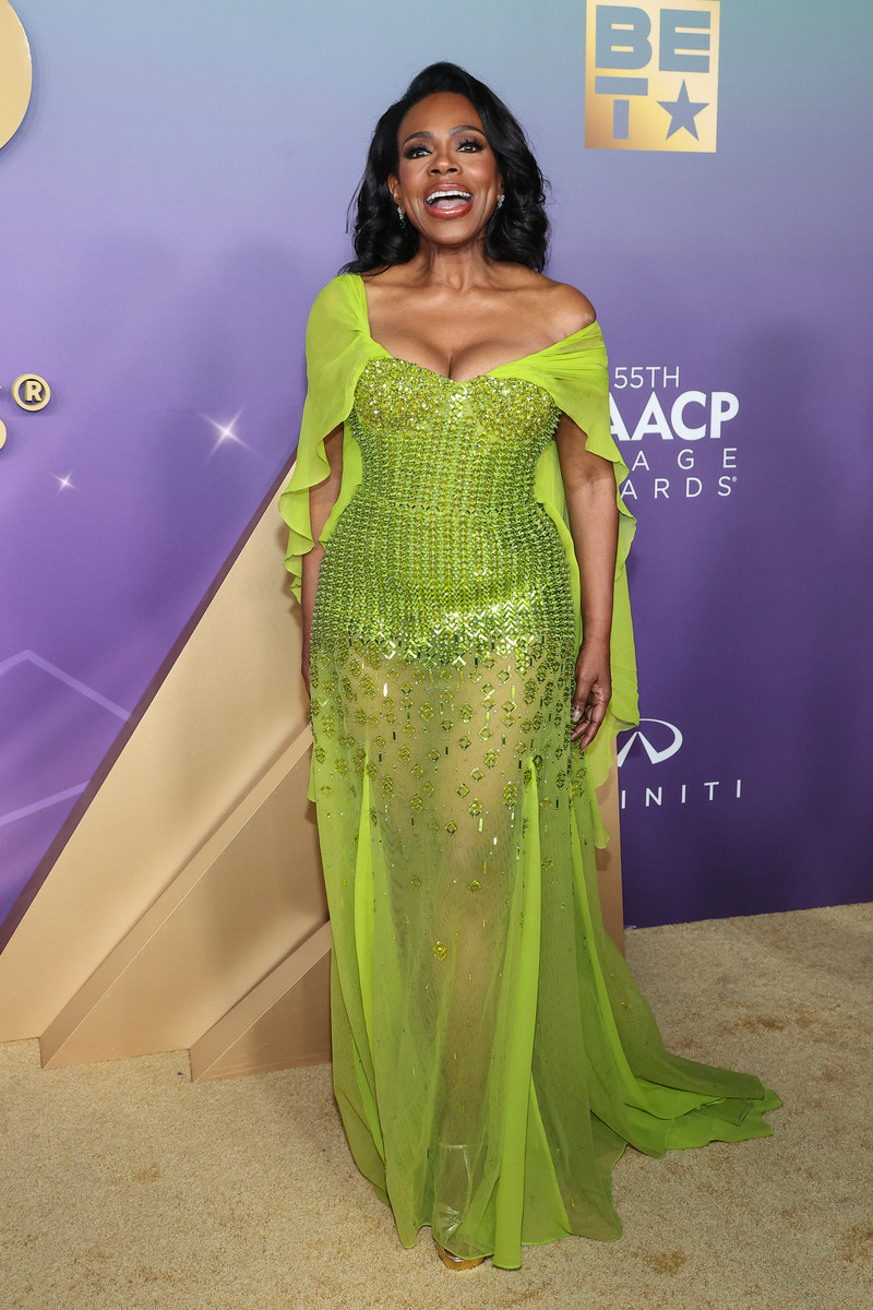 أطلّت كوين لطيفة Queen Latifah بفستان من توقيع أوسكار دو لارنتا على مسرح حفل توزيع جوائز NAACP Image Awards الخامس والخمسين، حيث عادت كمضيفة للحفل السنويّ للعام الثاني على التوالي. افتتحت الممثلة العرض بفستان طويل الأكمام مزيّن بالكريستال، تميّز بطبقة خارجيّة شفّافة مع زخارف من الوريقات مزيّنة بالترتر في جميع الأنحاء، في الوقت الذي بدت فيه ياقته المستديرة رائعة.