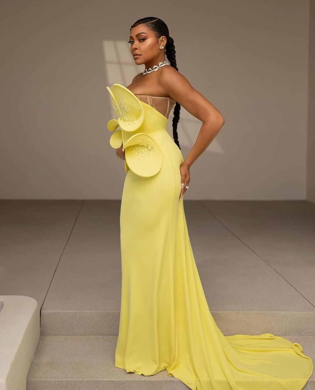 تميّز أيضا فستان Sheryl Lee Ralph من توقيع المبدع اللبناني العالمي جورج حبيقة ونجله جاد بكاب من قماش الشيفون المنسدل، فضلاً عن تزيينه بالترتر المتدرّج. وأكملت إطلالتها بأقراط من W.Salamoon وحذاء ذهبيّ بمنصّة عالية من Saint Laurent.