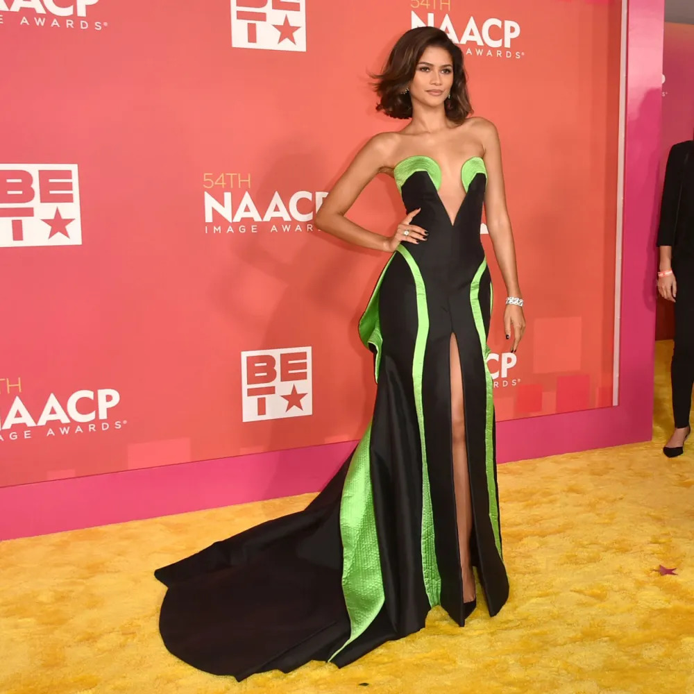 ارتدت النجمة Zendaya فستاناً بتوقيع فيرساتشي هوت كوتور من الحرير الأسود والأخضر من مجموعة ربيع 2002، فتميّز بشقّ مرتفع على الفخذ، وانتعلت حذاء أسود لامعاً، كما تزيّنت بمجوهرات مرصّعة بالكريستال على معصمها وأصابعها.