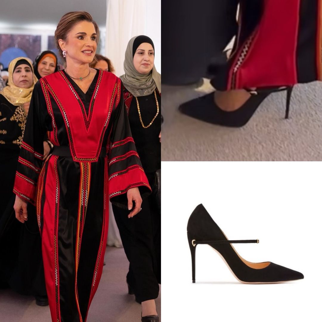 بقفطان أنيق من الساتان دو شاس الأسود والبورغاندي، دخلت رانيا ملكة الأردن إلى مأدبة الإفطار التي أقامتها في جرش. يتميّز القفطان بأكمام كيمونو مع تقطيعات هندسيّة متداخلة باللون الأسود. حملت الملكة "كلاتش" مميّزاً من الساتان والمخمل بتوقيع Elena Ghisellini، وانتعلت حذاء أسود من توقيع Jennifer Chamandi، التي يبدو أنّها الماركة المفضّلة لديها. واستكملت أكسسواراتها بشوكر رفيع على العنق وأقراط دائريّة صغيرة.