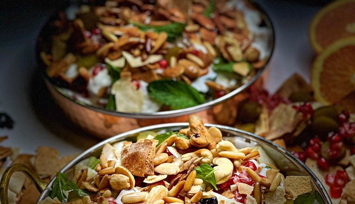 للزينة: خبز، رمان، نعناع، كبيس خيار، مكسرات.