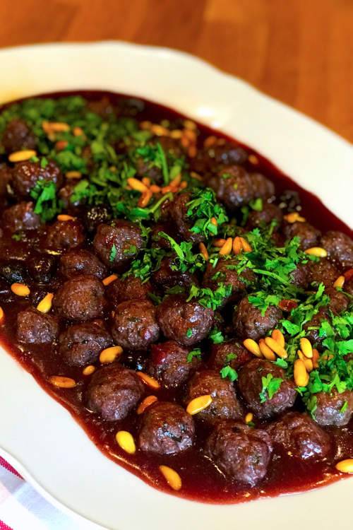 - الخطوة 6: في صحن التّقديم، نضع الخبز، ثم نضع فوقه اللّحمة بالكرز، ثم نزيّنه بالقدونس والصنوبر.
