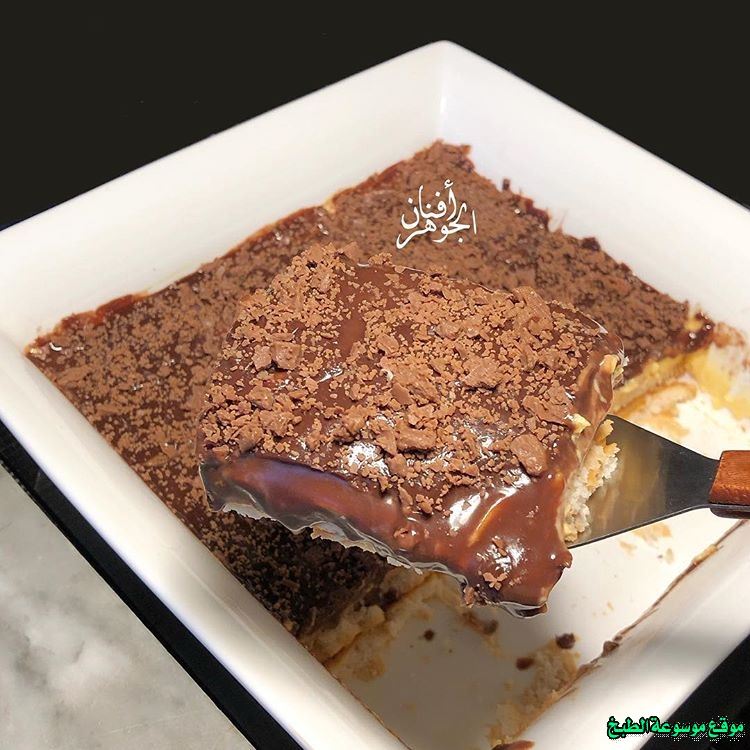 - نغمّس حبات البسكويت بالحليب ونضعها في طبق التقديم كطبقة أولى، ثم نضيف طبقة من مزيج القشطة والشوكولا.