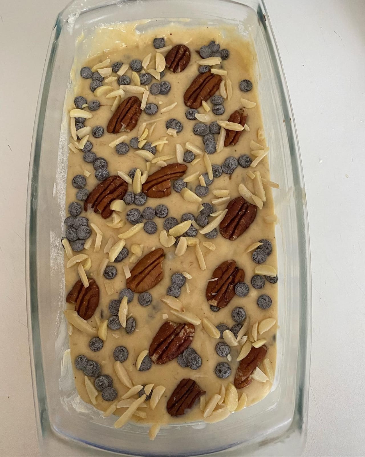 - الخطوة 3: نضع المجموع في قالب مدهون بالزّبدة، وعلى الوجه نضع الشوكولاتة والجوز واللوز. ندخل المستحضر إلى فرن محمّى مسبقاً على حرارة تبلغ ١٨٠ درجة لمدّة ٤٠ دقيقة تقريباً (حسب الفرن).