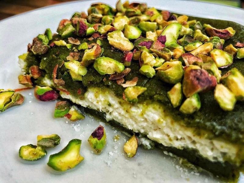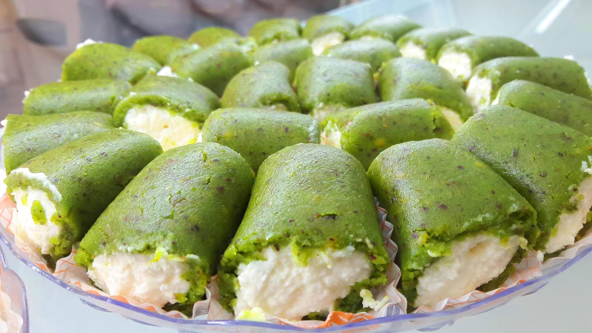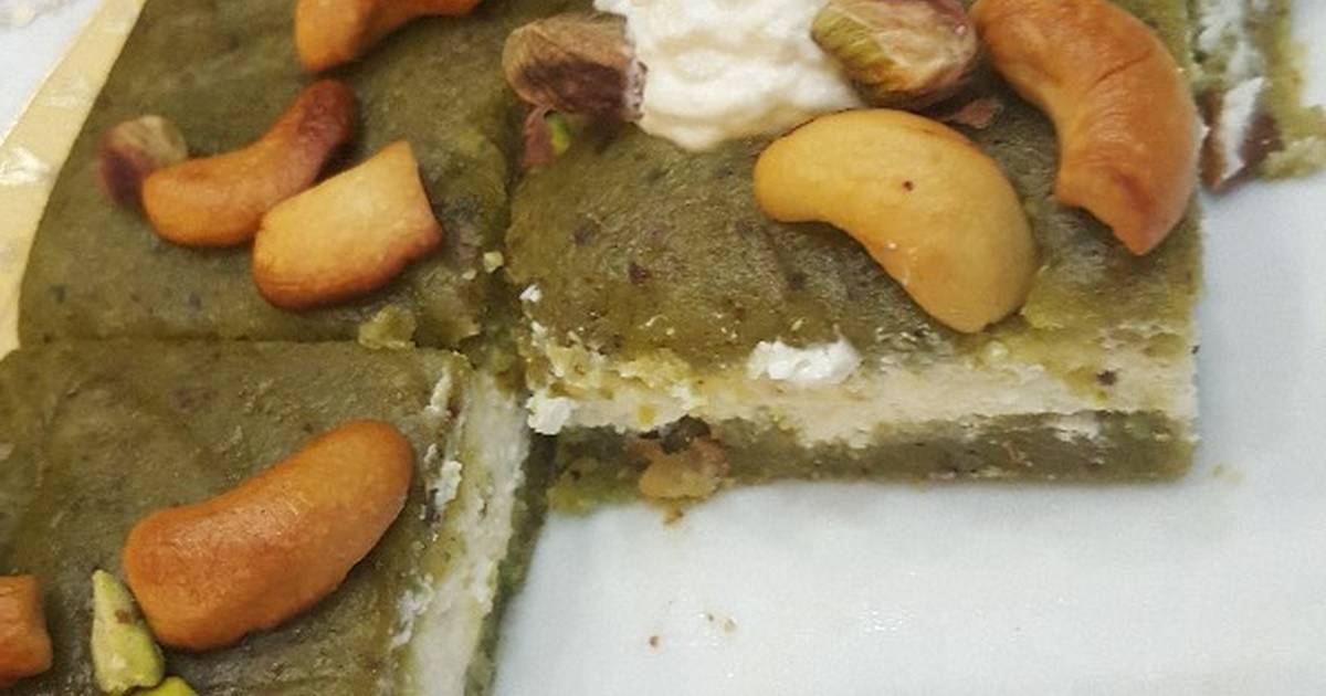 - الخطوة 5: ندهن صينيّة التقديم بالقطر ونمدّ الطبقة الأولى من عجينة الفستق، ثم نضيف عليها القشطة ونضعها في البرّاد حتّى تبرد وتجمد، ثمّ نخرجها ونمدّ الطبقة الثانية فتصبح جاهزة للتقديم.