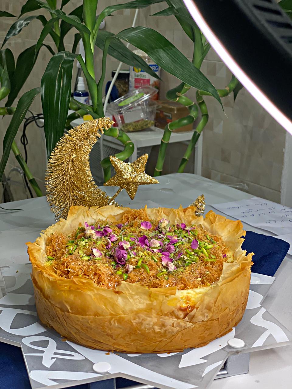 - زينوا وجه التشيزكيك بالكنافة المحمصة بالزبدة وثم أضيفوا القطر والفستق الحلبي.