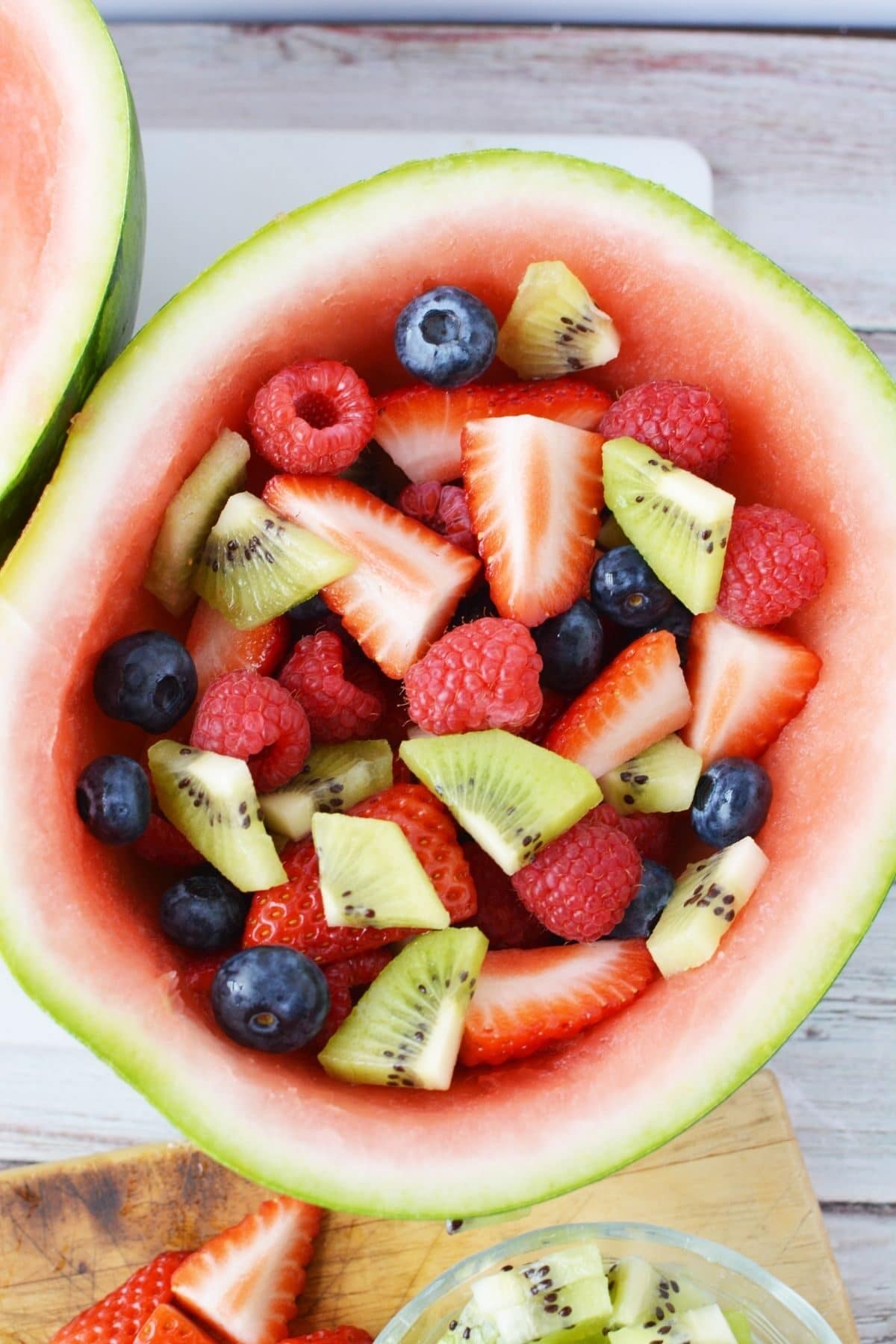 - نضع الجبنة والحلوى أو الفاكهة المفضّلة لدينا في داخل البطيخة.