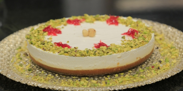 - الخطوة 4: نسكب الخليط في صحن التقديم، ونضع عليه القشطة العربيّة أو المغليّة أو علبة القيمر، ونزيّنه بالفستق الحلبيّ المبروش، ونقدّمه بارداً.