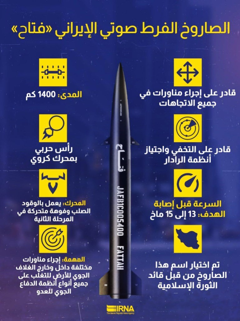 كشف التلفزيون الإيراني أنّ الحرس الثوري استخدم للمرة الأولى صواريخ "فتاح" الفرط صوتية في الهجوم الواسع على إسرائيل.