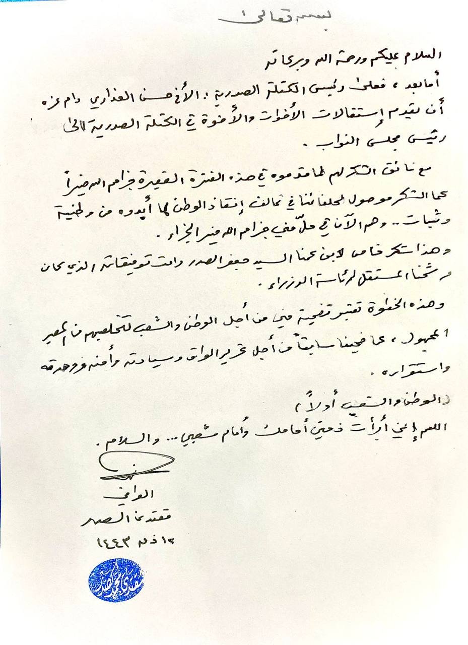 وقال في بيان إن "على رئيس الكتلة الصدرية حسن العذاري أن يقدم استقالات الأخوات والإخوة في الكتلة الصدرية إلى رئيس مجلس النواب، مع فائق الشكر لهم لما قدموه في هذه الفترة القصيرة جزاهم خيراً كما الشكر موصول لحلفائنا في تحالف إنقاذ الوطن لما أبدوه من وطنية وثبات... وهم الآن في حل مني جزاهم الله خير الجزاء".