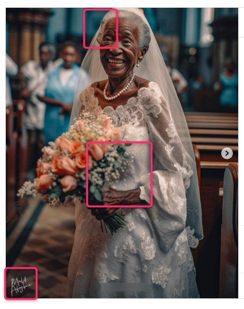 إلا أنّ عناصر عدّة تثير الشكّ في أن تكون هذه الصورة حقيقيّة منها التغبّش على مستوى الرأس وبين يد السيّدة وباقة الزهور، ما يؤشّر إلى أنّها قد تكون وليدة برنامج ذكاء اصطناعي.