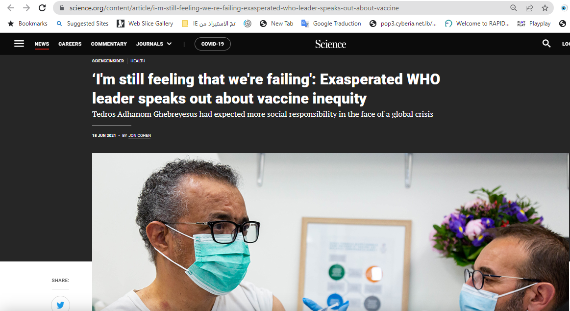 وقد عنون يومذاك موقع Science المقابلة مع تيدروس "ما زلت أشعر بأننا نفشل: مدير منظمة الصحة العالمية الغاضب يتحدث عن عدم المساواة في اللقاحات".