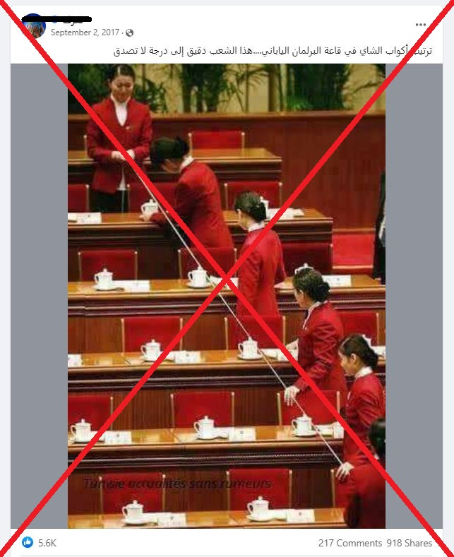 آلاف المشاركات والتعليقات حصدتها صورة على مواقع التواصل الاجتماعي على مدى سنوات، ادعى ناشروها أنها تُظهر كيفية "ترتيب فناجين الشاي في البرلمان الياباني". إلا أن الادعاء غير صحيح، فالصورة مُلتقطة في الحقيقة في البرلمان الصيني.
