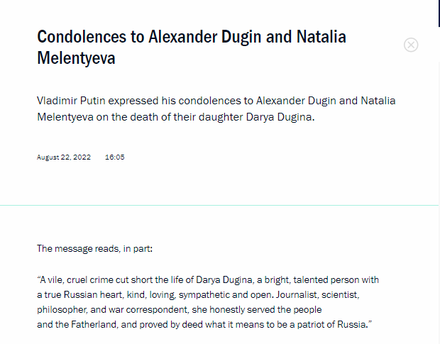 في الواقع، كان للرئيس بوتين تعليق على مقتل دوغين، بحيث اعتبر أنّ قتلها "جريمة دنيئة". وقال في رسالة تعزية نشرها الكرملين (هنا) في 22 آب، وموجّهة إلى عائلة دوغين: "جريمة دنيئة ووحشية وضعت حدّاً لحياة داريا دوغين قبل أوانها، وهي كانت لامعة وموهوبة وتمتلك قلباً روسياً حقيقياً"، مشيرا الى ان دوغين "خدمت بأمانة الشعب والوطن، وأثبتت بالفعل ما يعني أن يكون المرء وطنيًا لروسيا".