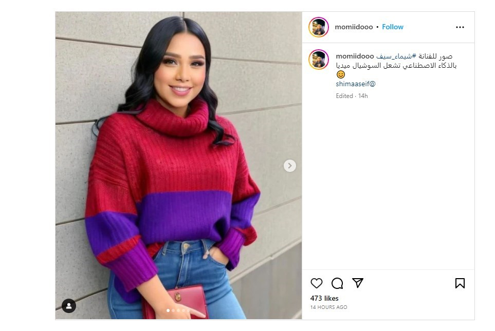 وقد أعادت الممثلة المصريّة مشاركة هذا المنشور- الذي يقول صراحة إن الصور وليدة ذكاء اصطناعي- عبر خاصية "الستوري" في حسابها على موقع إنستغرام.