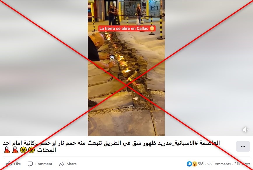 وقد جاء في النصّ المرفق "العاصمة الإسبانيّة مدريد: ظهور شقّ في الطريق تنبعث منه حمم نار أو حمم بركانيّة أمام أحد المحلاّت".