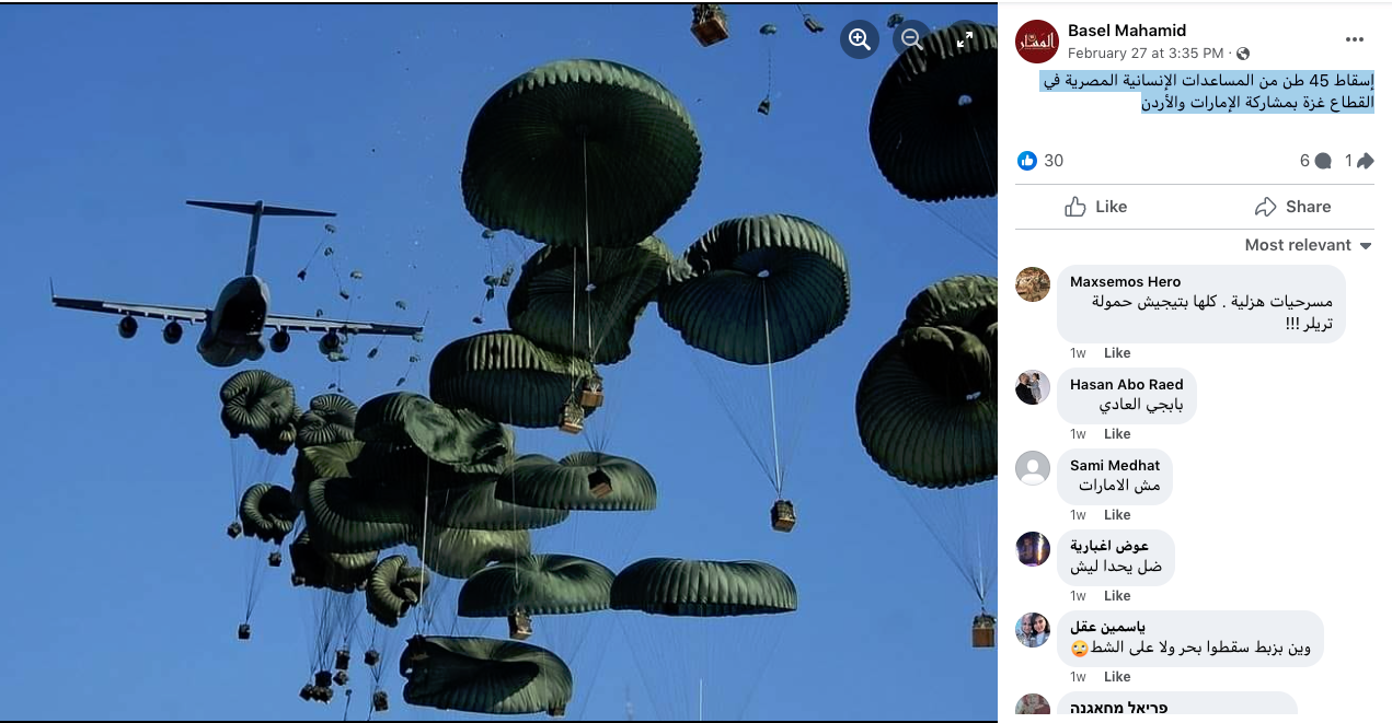 انتشرت صورة على مواقع التواصل الاجتماعي تظهر، وفقاً للمزاعم، "إسقاط 45 طنا من المساعدات الإنسانية المصرية في شمال قطاع غزة ووسطه، بمشاركة الإمارات والأردن". الا انه بحسب تحقيقات "النّهار"، اتضح أن هذا المنشور غير صحيح. FactCheck#