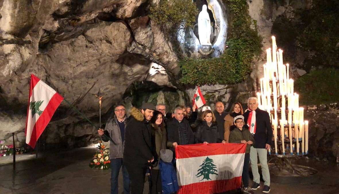 اجتمعت مجموعة لبنانية ورفعت على نية السلام في لبنان في مقام العذراء سيدة لورد - فرنسا وحملوا الاعلام اللبنانية.