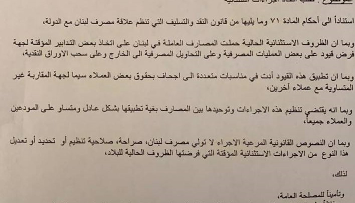 وبما أن الظروف الإستثنائية الحالية حملت المصارف العاملة في لبنان على اتخاذ بعض التدابير المؤقتة لجهة فرض قيود على بعض العمليات المصرفية وعلى التحاويل المصرفية إلى الخارج وعلى سحب الأوراق النقدية،