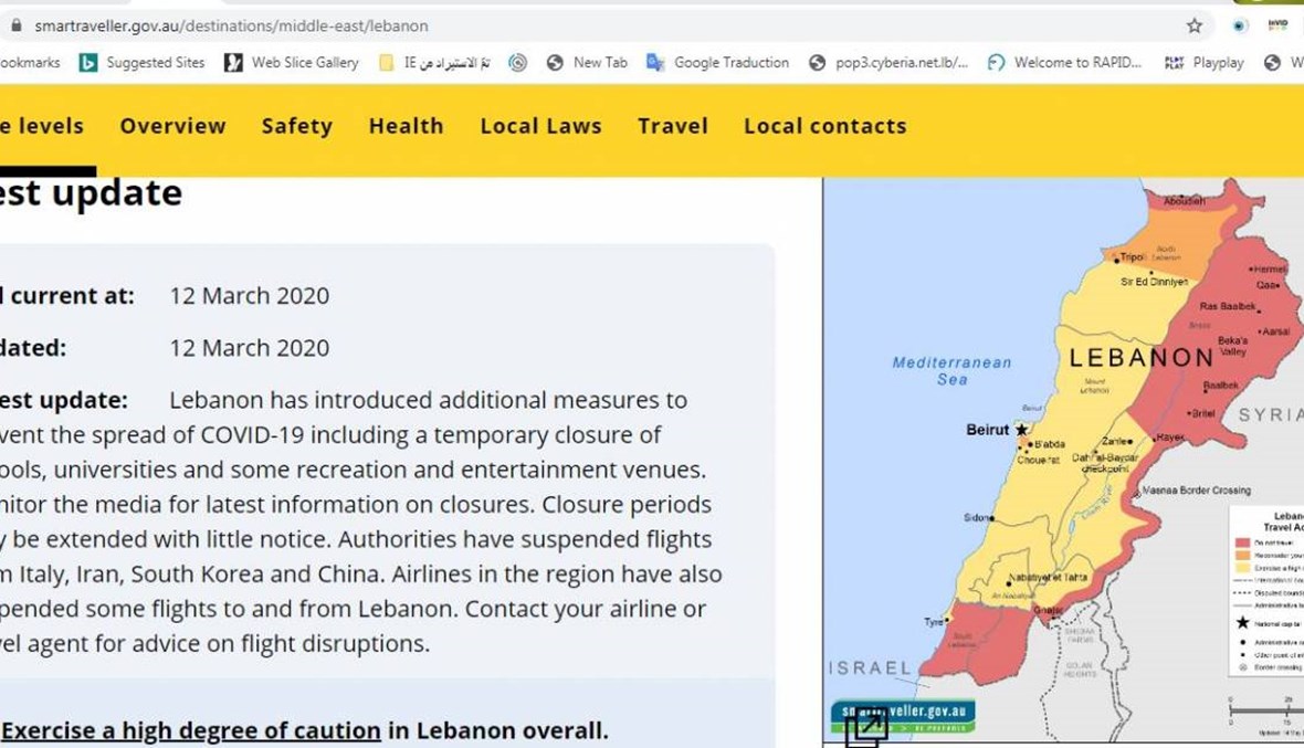 في نص محدّث اليوم الخميس 12 آذار 2020، كتب الموقع (الترجمة الى العربية): "أدخل لبنان إجراءات إضافية لمنع انتشار كوفيد-19 (COVID-19)، بما في ذلك الإغلاق الموقت للمدارس والجامعات وبعض أماكن الترفيه والتسلية. تابع وسائل الإعلام للحصول على أحدث المعلومات عن عمليات الإغلاق. فترات الإغلاق يمكن تمديدها بعد إشعار بسيط. وقد علقت السلطات رحلات من إيطاليا وإيران وكوريا الجنوبية والصين. كذلك، علقت شركات الطيران في المنطقة بعض الرحلات الجوية من لبنان وإليه. اتصل بشركة الطيران أو وكيل السفر للحصول على نصيحة بشأن تعطيل الرحلات".