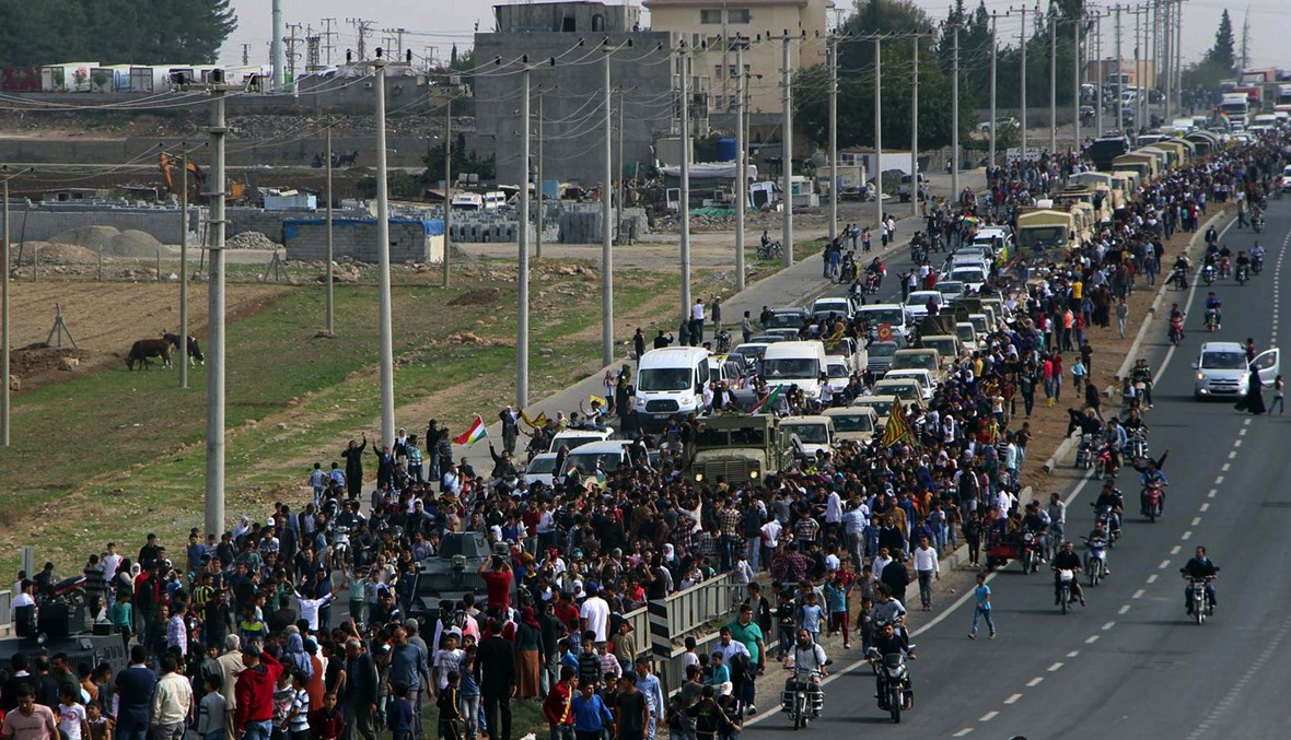 وخرج آلاف الأشخاص الى شوارع مدينة سروج التركية الحدودية ونزلوا الى ميدانها الرئيسي الذي تحفه الأشجار وانتشروا في الشوارع الجانبية ورسم البعض على وجوههم ألوان العلم الكردي ووقفوا في انتظار القافلة للترحيب بها.