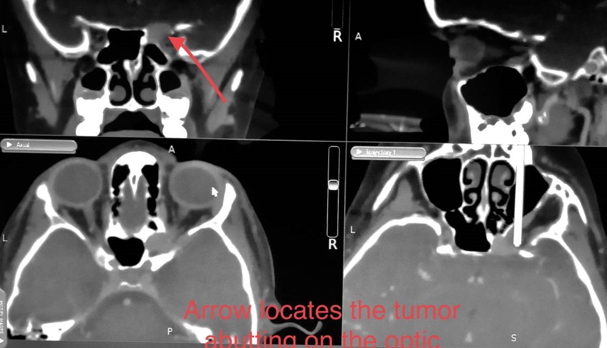 وقد أجريت العملية على الطفلة بعد أن ضغط الورم على عصبها البصري، مما أدّى إلى تدهور رؤيتها إلى حد العمى. وبعد أسبوعين من الجراحة، بدأت تتراءى للمريضة ظلال الضوء. ولمعالجة هذا النوع من الأورام، التي تندرج ضمن إطار أورام قاعدة الجمجمة، كان الأطباء يعمدون سابقاً إلى جراحة الدماغ المفتوح (حج القحف).