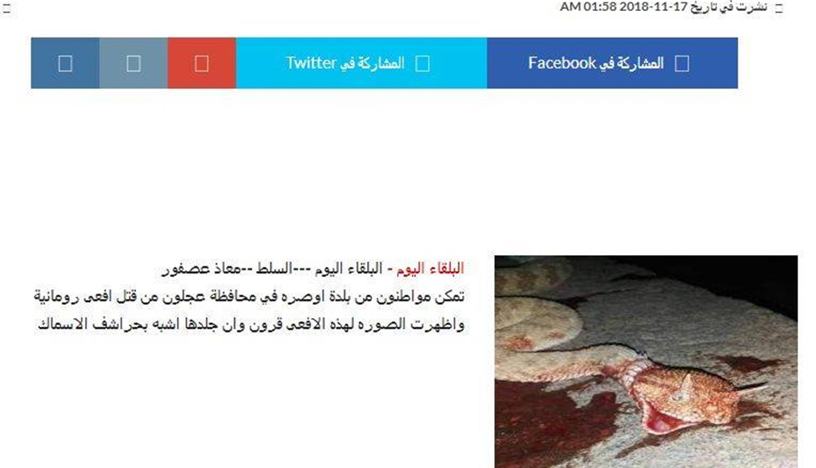 في 12 ت2، نشر موقعا "الامناء نت" و"اخبار اليمن الآن" (YemenNews) اليمنيان الصورة نفسها، مرفقة بخبر عن قتل احد المواطنين "للافعى الخطيرة" في منطقة الضالع. "شاهد الحية التي تم قتلها في الضالع"، عنوان الخبر. ولم يورد تفاصيل اخرى، في وقت عمدت مواقع اخبارية يمنية اخرى، منها "إب برس" (13 ت2)، الى تناقل الصورة والخبر نفسيهما بعد ايام قليلة. "شاهد الصورة المرعبة: الافعى القرناء تظهر بالضالع"، وفقا لعنوان "يمن 24" (16 ت2 2018).