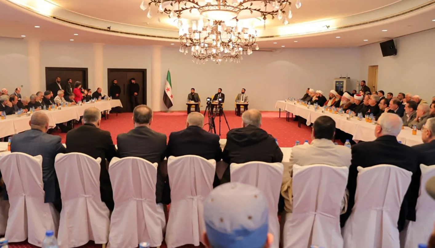أحد اجتماعات القوى المحلية في اللاذقية بحضور الرئيس السوري الانتقالي أحمد الشرع. (أ ف ب)