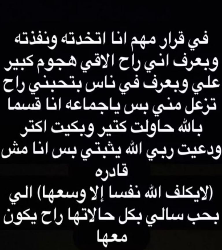وتمنت من متابعيها حينها، تفهم خطوتها، وكتبت في إحدى منشوراتها: "هناك قرار مهم أنا اتخذته ونفذته وأعرف أنني سأتعرض لهجوم كبير. وأعرف أن البعض ممن يحبني سيغضب مني. يا جماعة، قسماً بالله حاولت كثيراً وبكيت أكثر ودعيت ربي، الله يثبتني لكنني لم أستطع".