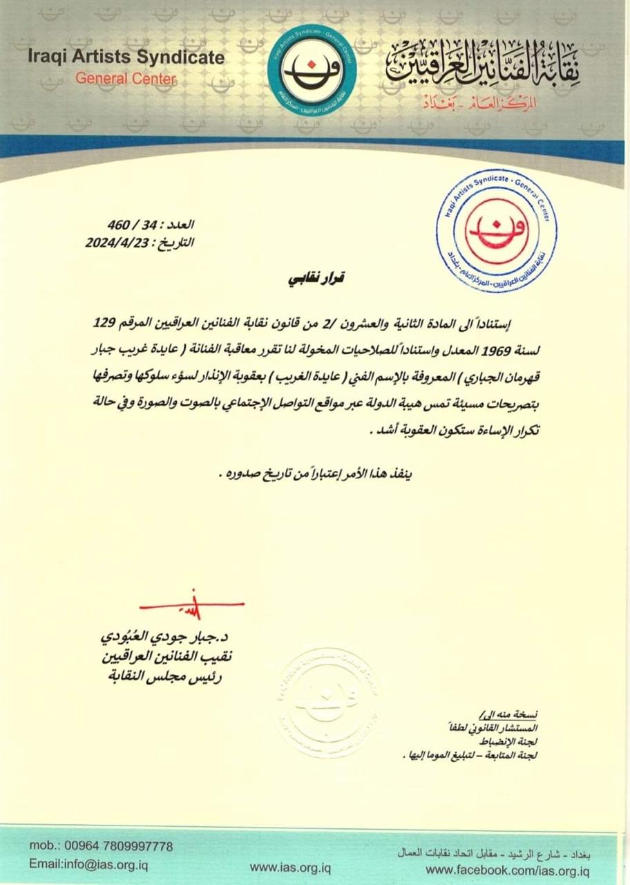 وجاء في وثيقة للنقابة، أنه "تقرر معاقبة الفنانة (عايدة غريب جبار قهرمان الجباري) المعروفة بالاسم الفني (عايدة الغريب) بعقوبة الإنذار لسوء سلوكها وتصرفها بتصريحات مسيئة تمس هيبة الدولة عبر مواقع التواصل الاجتماعي بالصوت والصورة".