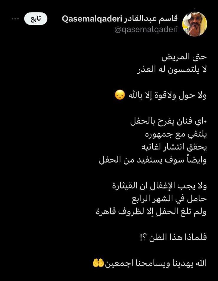 وكان الأخير أعلن أن حمل المطربة الخليجية، هو سبب إلغاء حفلها الأخير بداعي إصابتها بوعكة صحيّة، قائلاً: "حتى المرض لا يلتمسون له العذر، ولا حول ولا قوة إلا بالله، أي فنان يفرح بالحفل، يلتقي مع حمهوره، يحقق انتشار اغانيه، وايضاً سوف يستفيد من الحفل، لا يجب الإغفال ان القيثارة حامل في الشهر الرابع ولم تلغ الحفل إلا لظروف قاهرة، فلماذا هذا الظن؟! الله يهدينا ويسامحنا أجمعين".