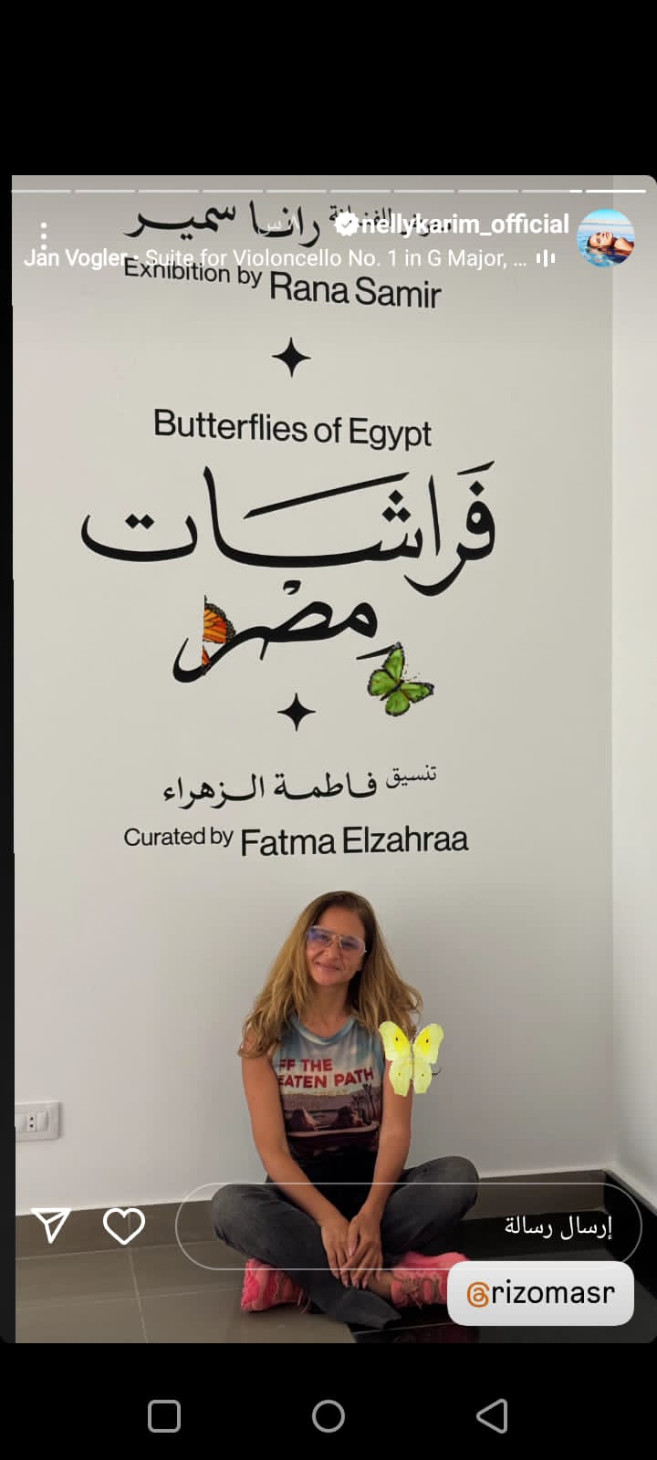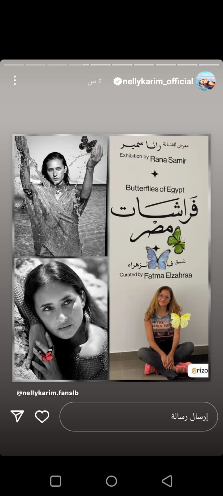 حرصت أيضاً على دعم معرض فني بعنوان "فراشات مصر"، يحمل العديد من الصور المرسومة لها، وشاركت الجمهور بعدد منها معبّرة عن إعجابها بها، ولم تكتف بذلك بل شاركتهم بجلسة تصوير جديدة.