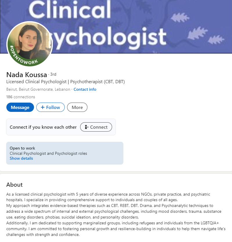 وفي خانة التعريف عنها، كتبت كوسا: "باعتباري طبيبة نفسية سريرية مرخّصة، ولديّ 5 سنوات من الخبرة المتنوعة في المنظمات غير الحكومية والممارسات الخاصة ومستشفيات الطب النفسي، فأنا متخصصة في تقديم الدعم الشامل للأفراد والأزواج من جميع الأعمار".