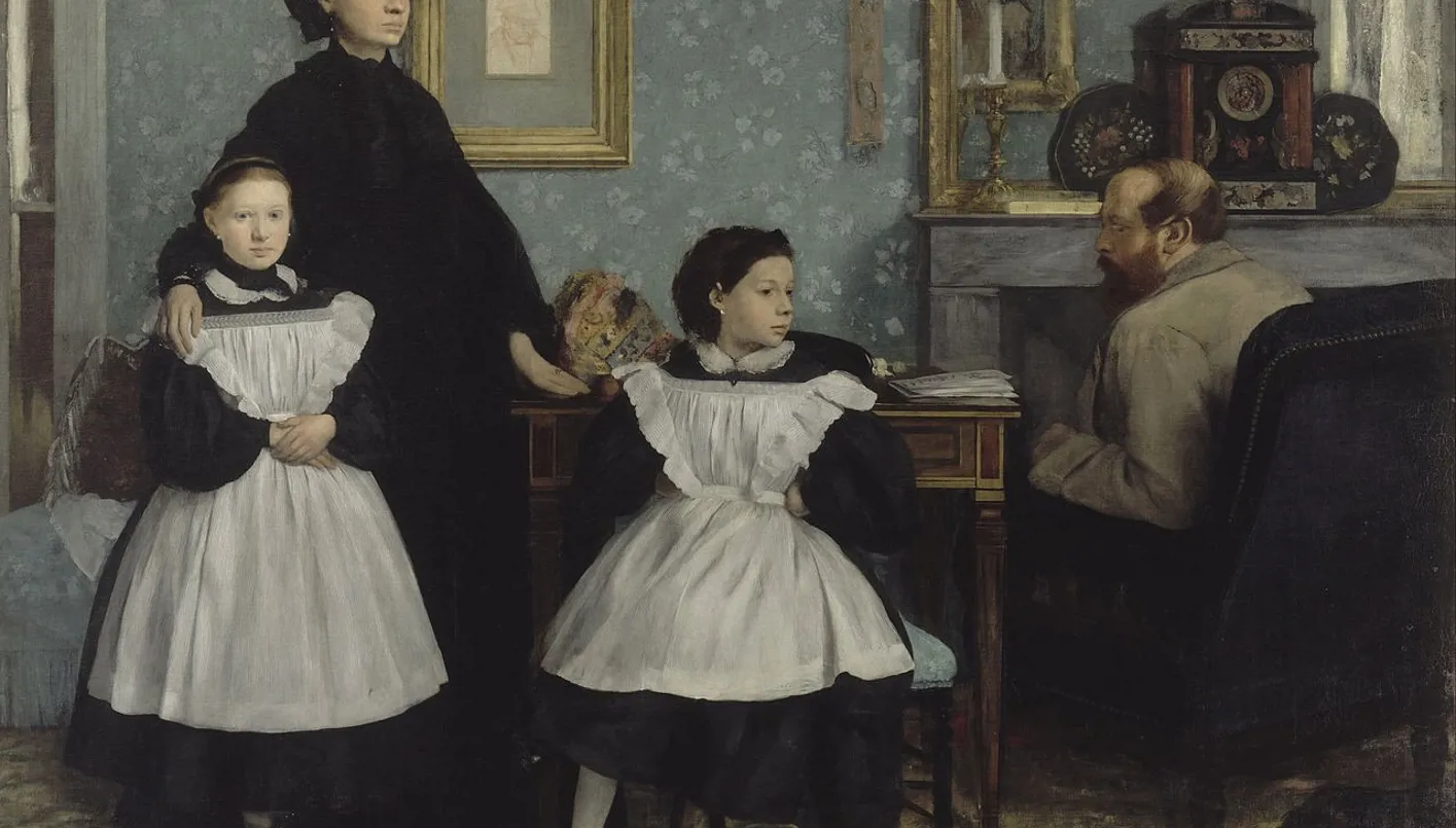 هي من أُولى لوحاته وأَكبرها حجمًا (علوّ نحو مترين وعرض نحو مترين ونصف المتر). رسمَها في إِيطاليا حيث كان يدرس الرسم، وكان لا يزال في العشرين. وفيها عمَّتُه لورا بيليلّي وزوجُها البارون غينّارو بيليلّي، وابنتَاهما جوليا وجيوفانَّا. وتبدو لورا في هيئة حزينة مأْساوية حدادًا على والدها المتوفى قبل أَيام، وتُمسك بابنتها البكر جوليا (10 سنوات). خلفها على الجدار صورةُ والدها الحديث الوفاة، فيما إِلى يمين اللوحة تبدو الصغرى جيوفانَّا (7 سنوات) جالسة على كرسي رافعة إِليه قدمَها اليُسرى فلا تظهر.