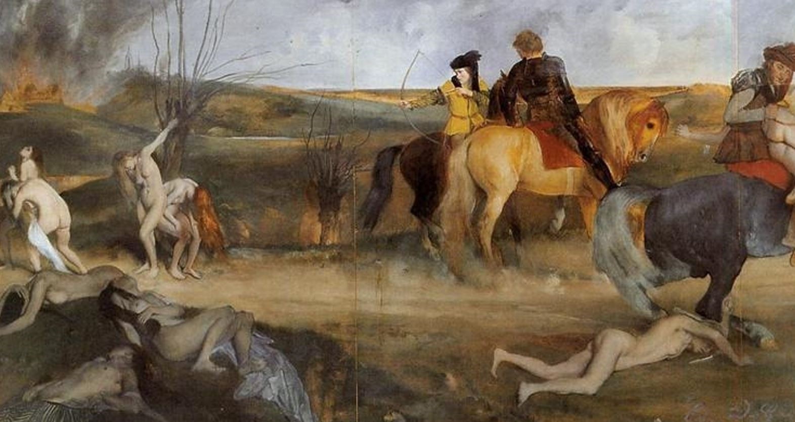 خلال دراسته الرسم تأَثَّر دوغا بكبار الرسامين، أَبرزُهم الكلاسيكي إِنْغْر (1780-1867) ورسامو النهضة، كما تأَثَّر بكتابات المؤَرخين اليونان واللاتين. من هنا أَنه انطلق في مسيرته التشكيلية برسم مواضيع من التاريخ. وبين عددٍ من اللوحات التي تقدَّم بها دوغا للاشتراك بــ"معرض باريس 1865" لم تختَر اللجنة التحكيمية سوى لوحة "مشهد من الحرب في القرون الوسطى" كانت هي الأُولى التي عُرضَت في ذاك "الصالون". وهي لوحة ذات أَلغاز: ليس فيها مرجع أَو حدَث تاريخي أَو أَدبي أُخذ منه موضوع اللوحة. فإِلى يسارها نساء عاريات بعضُهُنَّ أَكثرُ إِصابة من الأُخريات بجراح نصال الجنود. وفي أَعلى اللوحة إِلى اليسار منظرُ مدينة تحترق. ولا مبرر لوضع النساء بهذا الشكل في لوحة عن الحرب. من هنا أَن هذا الغموض أَدى بالبعض إِلى تسمية اللوحة "مآسي مدينة أُورليان". ربما لذلك لم تلفت اللوحة روَّاد معرض باريس عامئذٍ.