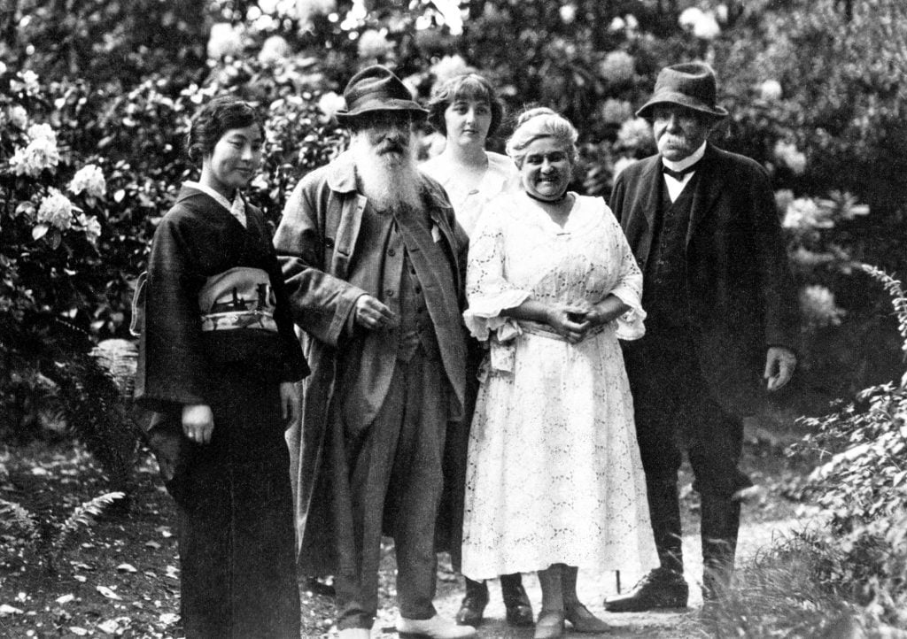من اليسار إلى اليمين: تاكيكو كوروكي، كلود مونيه، ليلي بتلر، بلانش هوشيديه مونيه، وجورج كليمنصو في منزل مونيه في جيفرني، عام 1921.