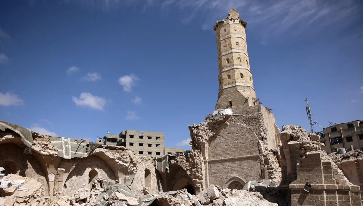 المسجد العمري الكبير وقد طاله القصف الإسرائيلي. (أ ف ب)