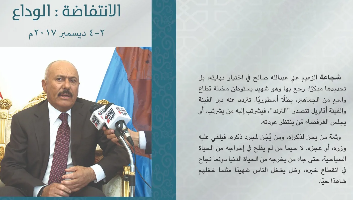 المقدمة والكلمات الأخيرة وصفت كذلك الأجواء والظروف التي شكلت وأثرت في تلك التحولات الحاسمة والفارقة في الصراع اليمني، وختمت حياة علي عبدالله صالح.