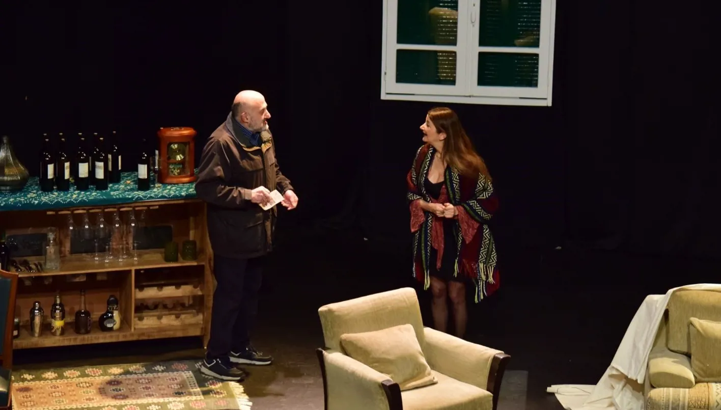 سوى أَن وحدتها لم تكتمل تمامًا. فعلى بابها ظهر "أَبو خالد" (الدكتور جاك مخباط) كي يوصل إِليها أَكياس مأْكولات كانت أَوصت عليها كي تكفيها مدَّة انفرادها في البيت. ومن مشهد إِلى آخر يتضح أَن المرأة و"أَبو خالد" يعيشان حالةً صعبة، هربا بسببها إِلى النأْي في وحدة ذاتية وخارجية قاسية يسعيان إِلى الخروج منها. فبعد انكشاف ما في قلبه من وجع صامت بسبب الوحدة، تنفرد المرأَة هي أَيضًا (نحو نهاية المسرحية) في مونولوغ وجداني ينمُّ عن حلْمها البعيد باسترجاع علامات الأُنوثة.