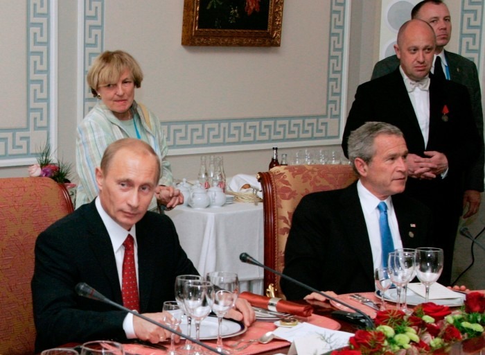 (عشاء عمل في أحد مطاعم بريغوجين بسانت بطرسبورغ سنة 2006 يجمع الرئيس الروسي فلاديمير بوتين ونظيره الأميركي حينذاك جورج بوش الابن - سبوتنيك/أب)