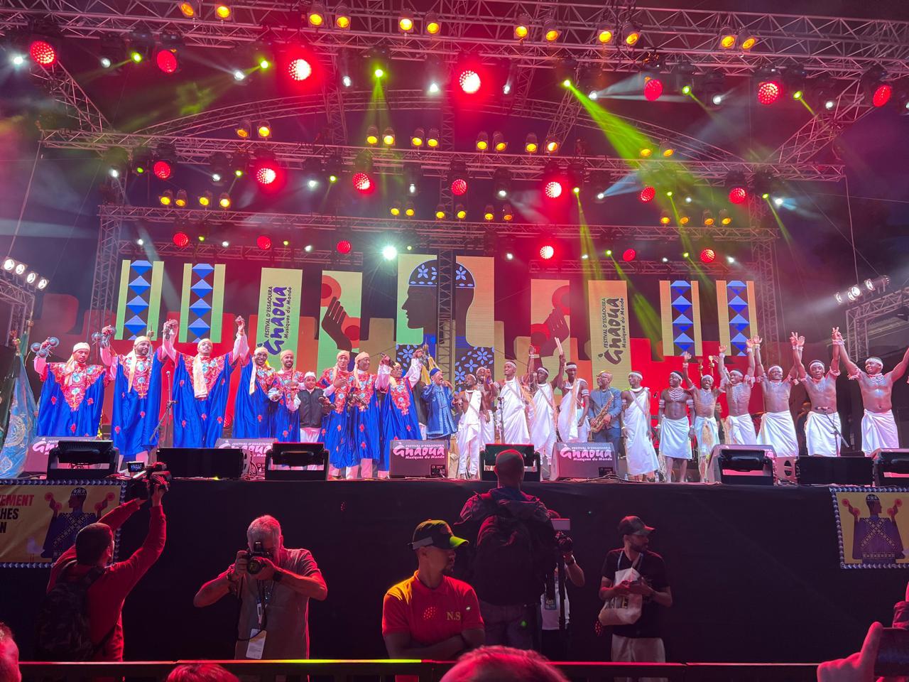 وسيشهد هذا العرض، لأول مرة، لقاء "استثنائيا" بين ثلاثة أصناف فنية مدرجة على قائمة اليونسكو للتراث الثقافي غير المادي، هي كناوة، الفلامنكو والزاولي، حيث سيمزج المعلمان حسن بوصو ومولاي الطيب الذهبي من المغرب، نفحاتهما الروحية مع إيقاعات المجموعة البرازيلية الملتزمة إيلي آيي، المكونة من عازفي إيقاع يروجون للمكوِّن الإفريقي في موسيقى "باهيا". في حين ستواجه مجموعة دومانلي، التي تمارس الزاولي - الفن الشعبي الإيفواري الذي يجمع، في نفس العرض، القناع والزي والموسيقى والرقص، فنان الفلامينكو نينو دي لوس رييس(إسبانيا) برفقة عازف الإيقاع سيرجيو مارتينيز (إسبانيا).