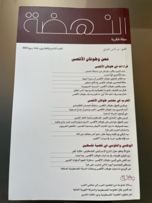 نطلّع على جزء من رأي النخبة الفكرية والسياسية المغربية في الباب الثالث المخصّص لموضوع: "الوطني والقومي في قضية فلسطين". يستهلّه الأكاديمي الاقتصادي فتح الله ولعلو رجل السياسة الاشتراكي بمقالة: "حول النزاع الإسرائيلي الفلسطيني: حكاية جَوْر"؛ والباحث السياسي عبد العلي حامي الدين في: "محاولة لفهم السلوك الغربي"؛ عمر الزيدي عالج المطلب المُلحّ: تداعيات طوفان الأقصى ورهانات الدولة الفلسطينية المستقلة". وانخرط عضو تحرير المجلة عبد الجليل طليمات في مناقشة "جداليات طوفان الأقصى وما بعده".