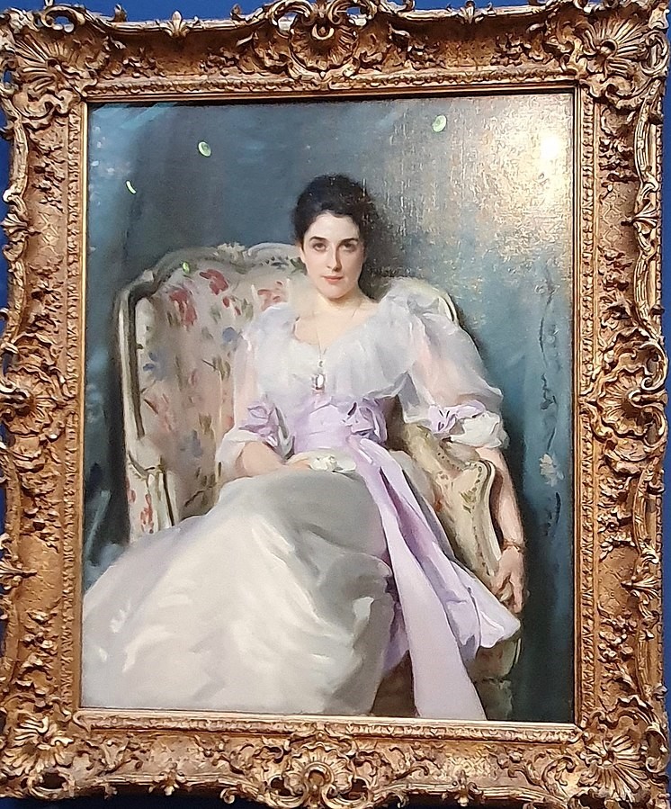 من هنا تبرز براعة سارجِنْتْ في التقاط الجوهري من السيّدة، برسمها في ما سوى ست جلسات (رقم قياسي سريع عصرئذٍ). وهو لم يحتَج إِلى جلسات أَكثر ليُبرز جمالات المرأَة وما عليها، بضربات حاذقة من ريشته وطبقاتها اللونية الشفافة المتتالية، ما يجعل اللوحة شاعرية المناخ كأَنها هائمةٌ في فضاء أَثيريّ عابق برياحين الخيال.