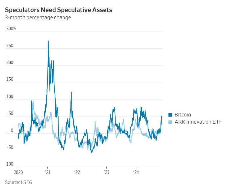 وتتمحور الحجة الثالثة حول تهديد التضخم. يراهن سوق السندات على أن سياسات ترامب ستؤدي إلى ارتفاع التضخم، وذلك بفضل التعريفات الجمركية والتخفيضات الضريبية. ومع ذلك، لم تكن عملة البيتكوين أبدًا تحوطًا جيدًا للتضخم، وهي تتحرك بشكل وثيق مع أسهم المضاربة أكثر بكثير مما تتحرك مع تحوطات التضخم مثل الذهب (الذي انخفض الآن منذ الانتخابات) أو السندات المرتبطة بالتضخم.