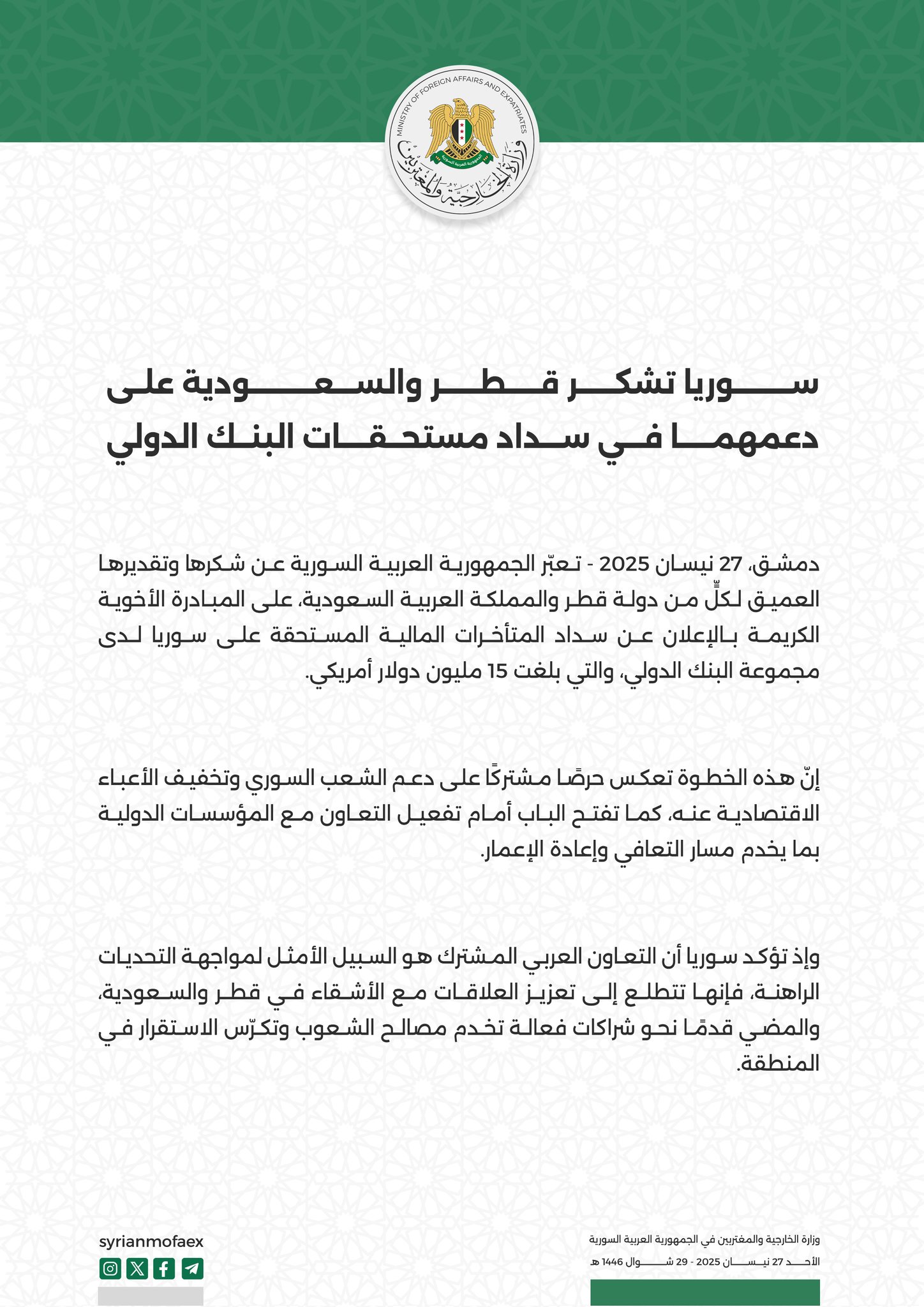 إلى ذلك، قدمت سوريا شكرها لقطر والسعودية على دعمهما في سداد مستحقات البنك الدولي.