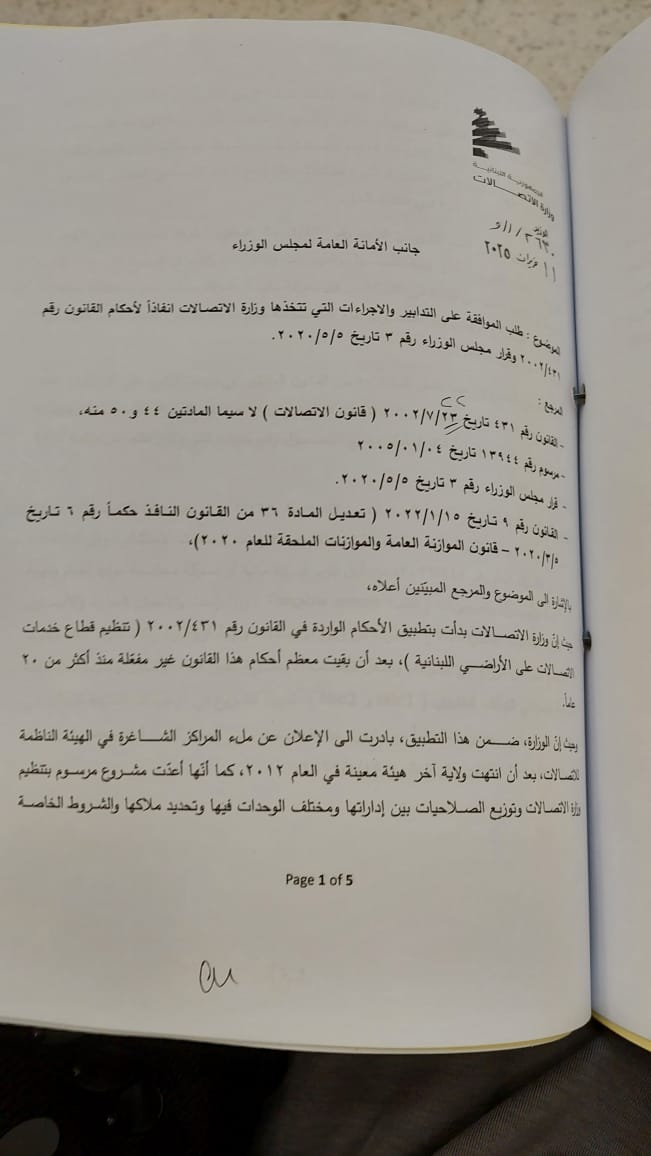 في 11 حزيران/يونيو 2025 أرسل وزير الاتصالات إلى الأمانة العامة لمجلس الوزراء كتابه رقم 2630/أ/و يطلب فيه إدراج بند في جدول مجلس الوزراء في شأن السماح لوزير الاتصالات بإعداد دفتر شروط للتعاقد مع شركة استشارية عالمية بقيمة مالية تراوح بين 1.5 ومليوني دولار بهدف تقييم الأصول الثابتة وغير الثابتة العائدة إلى وزارة الاتصالات وهيئة أوجيرو وشركتي الخليوي، تمهيدا لإنشاء المشغل الوطني للاتصالات شركة "ليبان تيليكوم". وأشار وزير الاتصالات في كتابه إلى أن شركتي الخليوي "تتحملان مناصفة المصاريف الناشئة عن العقد، من خارج بنود الموازنة السنوية الموافق عليها من وزيري المالية والاتصالات".